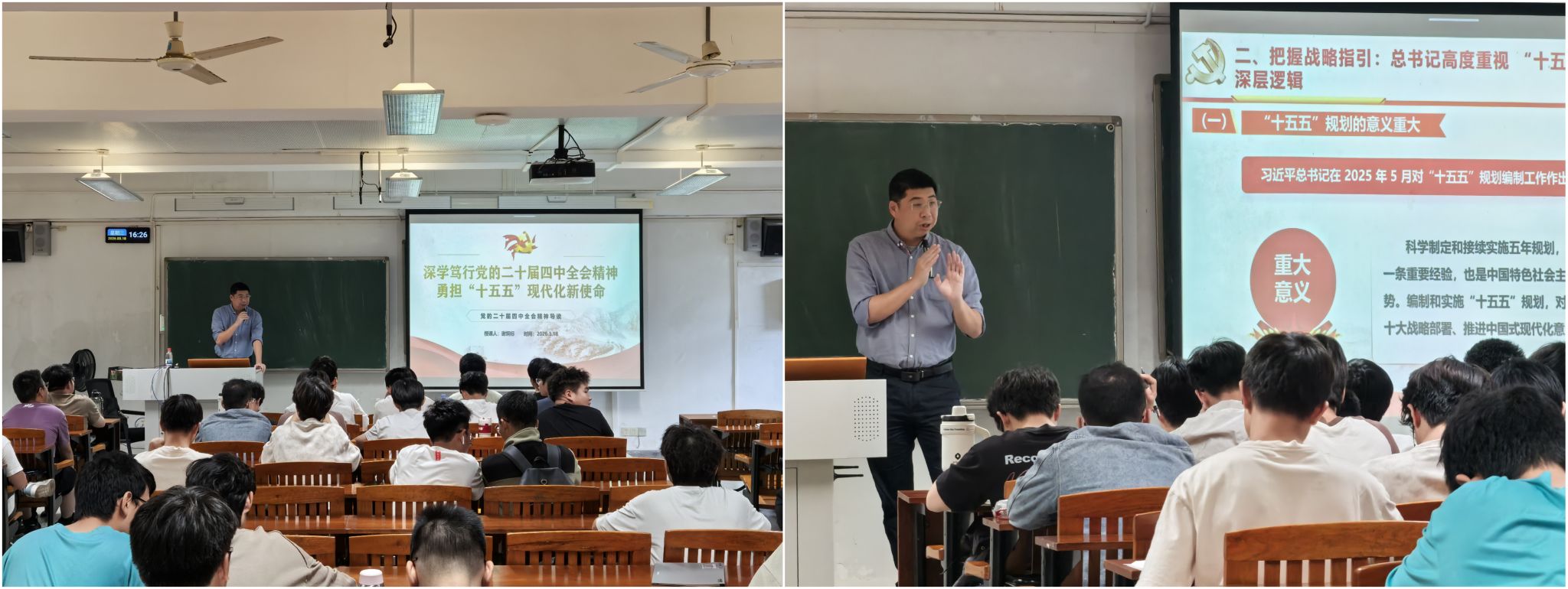3月18日下午,谢炯标以“深学笃行党的二十届四中全会精神 勇担‘十五五’现代化新使命”为题,为2025食品营养与健康1班、2025机器人1班(领航班)和2025机器人2班(奋辑班)全体同学授课。他带领同学们深入学习党的二十届四中全会核心要义,回顾“十四五”时期各领域建设成就,详细剖析全会对“十五五”时期经济社会发展作出的战略部署。结合主流媒体权威解读,他引导同学们明晰发展方向、凝聚奋进共识,勉励大家深学细悟全会精神,将个人理想融入国家发展大局,立足专业、脚踏实地,锤炼过硬本领,涵养奋斗精神,在“十五五”现代化建设浪潮中挺膺担当、奋勇争先,努力成为可堪大用、能担重任的新时代青年。